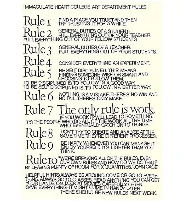 Au-delà de son œuvre artistique, elle est connue pour avoir listé 10 règles visant à libérer sa créativité :