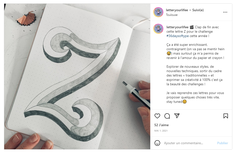 Tu as beaucoup de challenges qui se font sur les réseaux. Je pense notamment au « 36 Days of Type » qui a lieu en avril ou en mai.